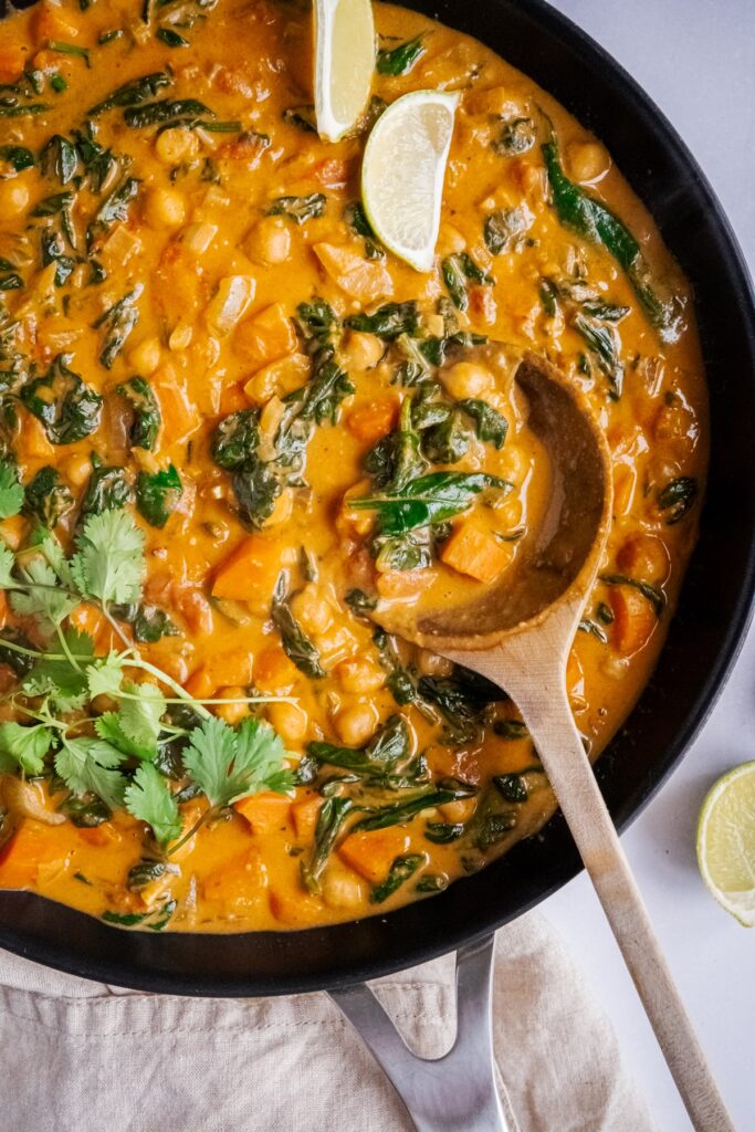 Der Klassiker ist duftender Basmati-Reis. Aber auch indisches Fladenbrot wie Naan oder Chapati eignet sich perfekt, um die Sauce aufzunehmen. Wer es frischer mag, kann dazu einen Klecks Joghurt (oder eine vegane Alternative) und frischen Koriander servieren.